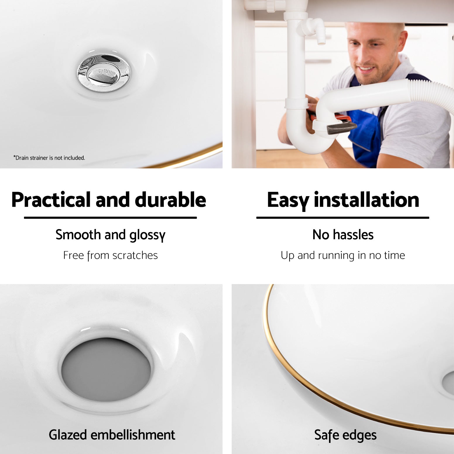 Experience luxury with our Modern Gold Streamline Vanity Basin. Made with high-quality ceramic, this elegant basin is practical and odourless. Its surface is anti-scratch, anti-bacterial, and leakproof, making it easy to maintain its lustrous shine. It is also heat-resistant, wear-resistant, crack-resistant, and fade-resistant, ensuring durability and longevity. The smooth edges offer a sleek and safe appearance. Enjoy peace of mind with its 5-year warranty, and easy installation process. Upgrade your bathroom with our stunning vanity basin today.